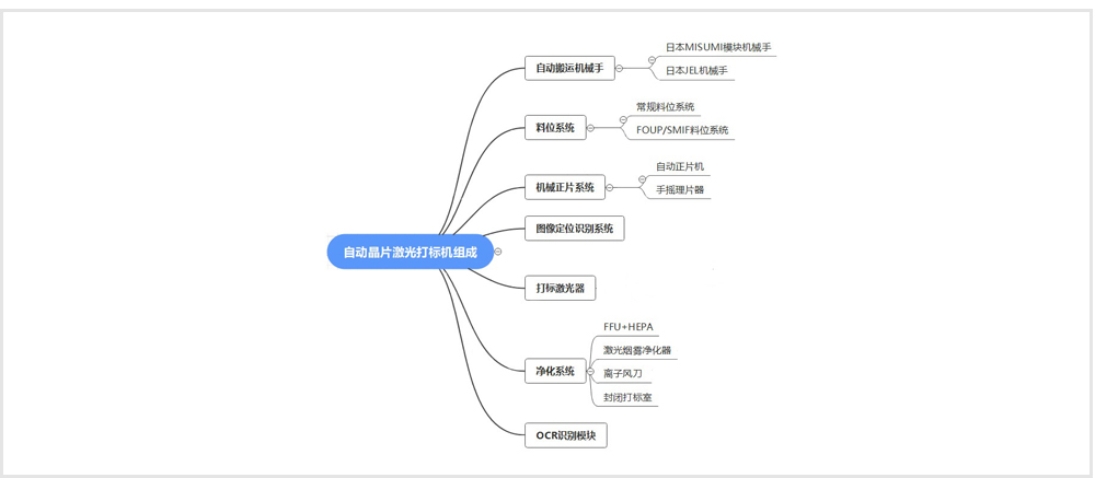 通過機械手搬運晶片,用特定激光器在晶片指定位置打標,實現對晶片的自動標記。可實現軟打標和硬打標。可打標半導體材料覆蓋:、Si、SiC、GaAs、InP、Al2O3(藍寶石)、Ge等材料。